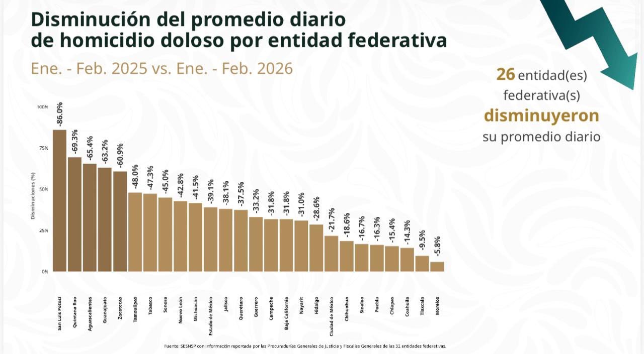 Durante la conferencia matutina de este martes, la presidenta Claudia Sheinbaum Pardo informó que 26 entidades del país lograron disminuir el promedio diario de homicidios dolosos, al comparar los periodos de enero-febrero de 2025 con el mismo lapso de 2026.